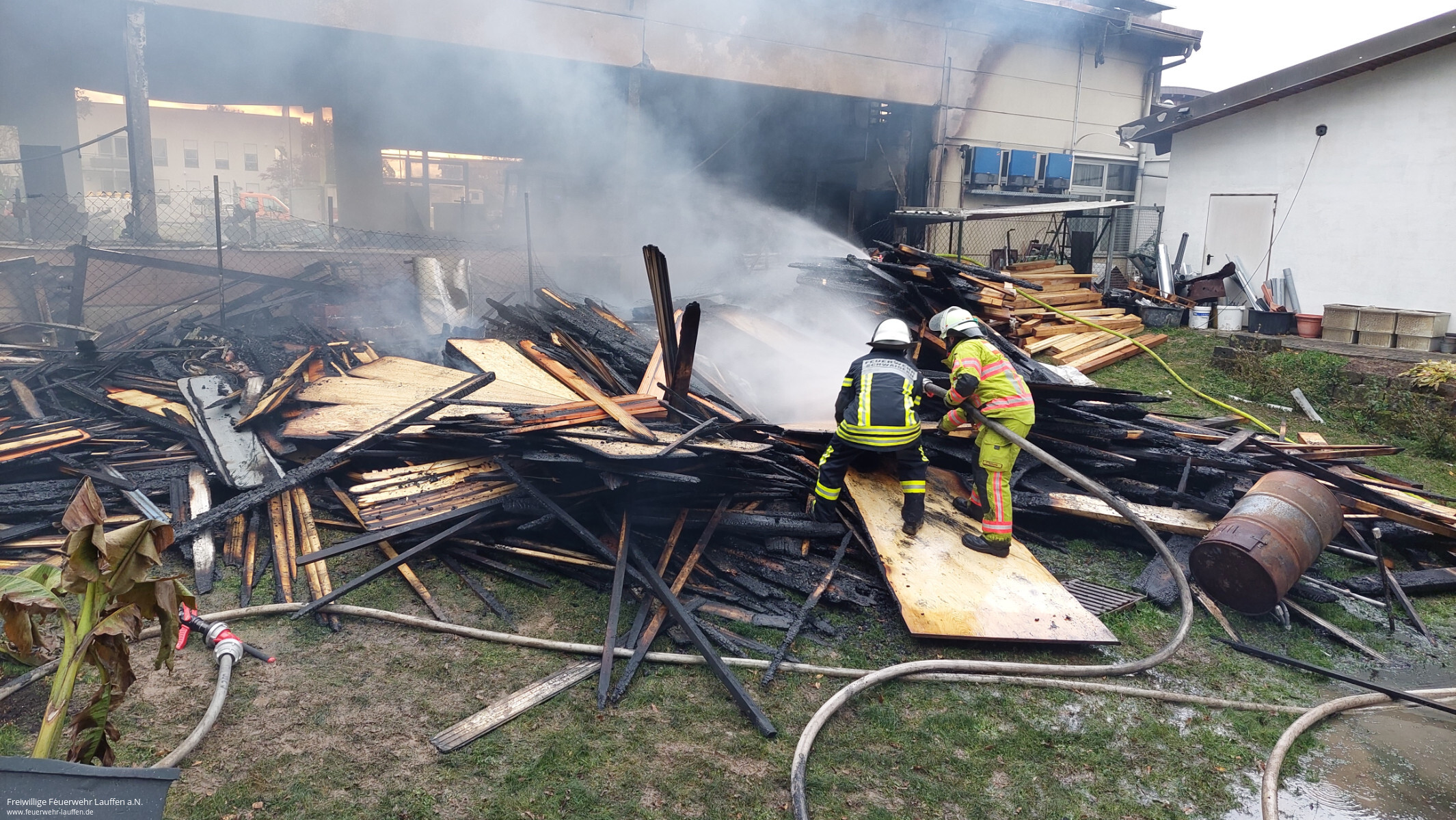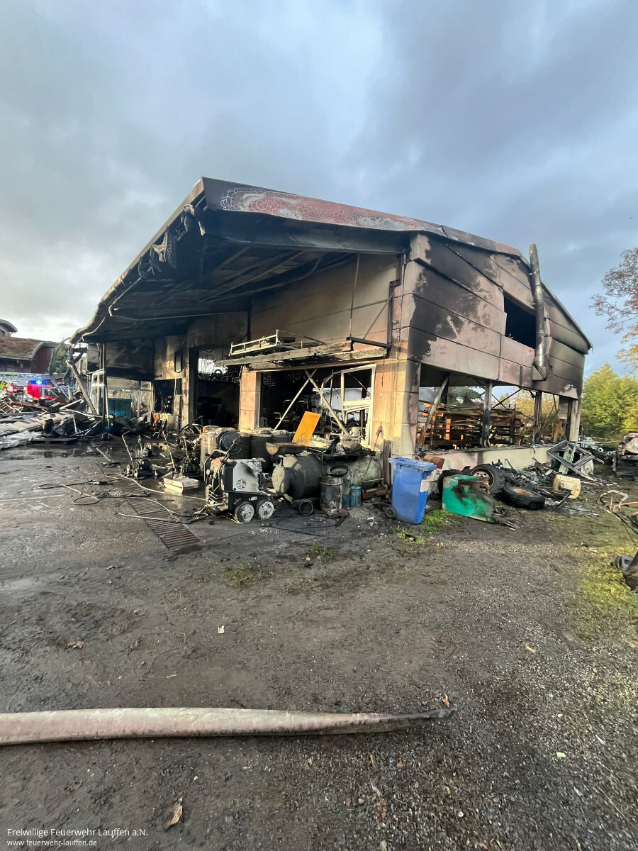 Mit Unterstützung des städtischen Bauhofes wurden im weiteren Einsatzverlauf Teile des Daches eingerissen, um an mögliche Glutnester zu kommen. Hinter dem Gebäude gelagertes Holz wurde ebenfalls auseinandergezogen und abgelöscht. Die Nachlöscharbeiten dauerten bis in die Abendstunden an.