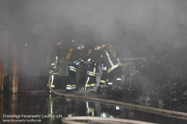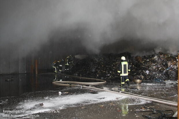 Nach etwa zwei Stunden war der Brand so weit unter Kontrolle, dass jetzt gezielt vorgegangen werden konnte, um die brennenden Ballen auszuräumen und abzulöschen. Dazu wurde der betroffene Hallenabschnitt mit Hilfe von mehreren Baggern ausgeräumt, das Material dabei abgelöscht, dann in Container verladen und auf einen Zwischenlagerplatz transportiert. Dort wurden von Feuerwehrkräfte bei Bedarf nachgelöscht.