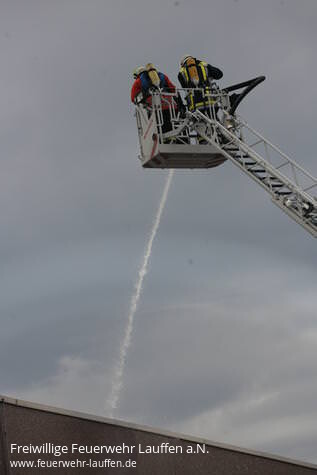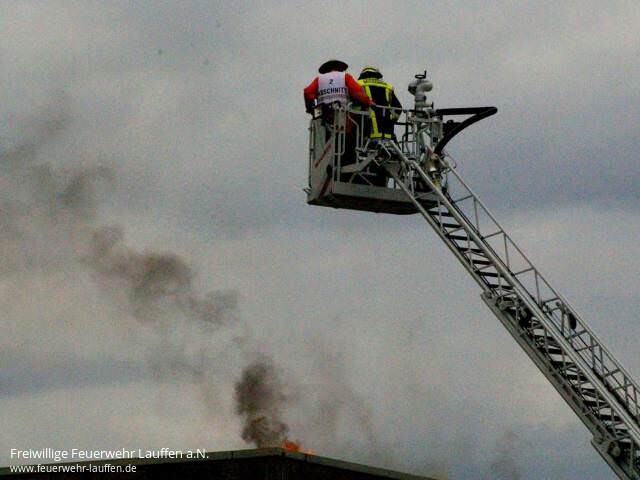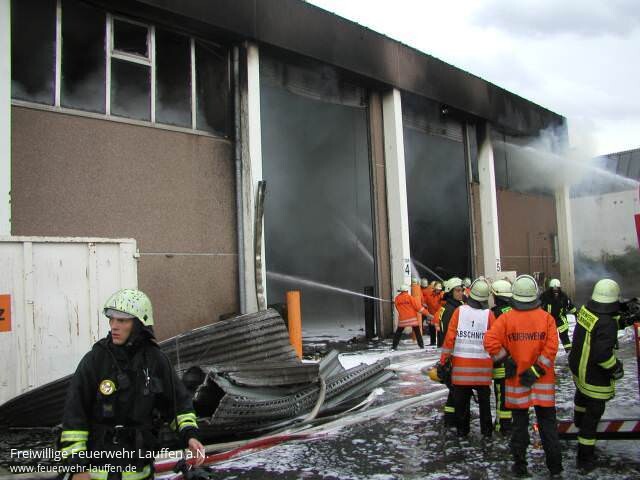 Kurz darauf kam es zu einer Durchzündung als ein Teil des Daches einstürzte. In den folgenden Minuten wurden ständig weitere Kräfte mit diversen Lösch- und Sonderfahrzeugen nachalarmiert. Eine Übersicht aller eingesetzten Fahrzeuge befindet sich am Ende des Berichts.