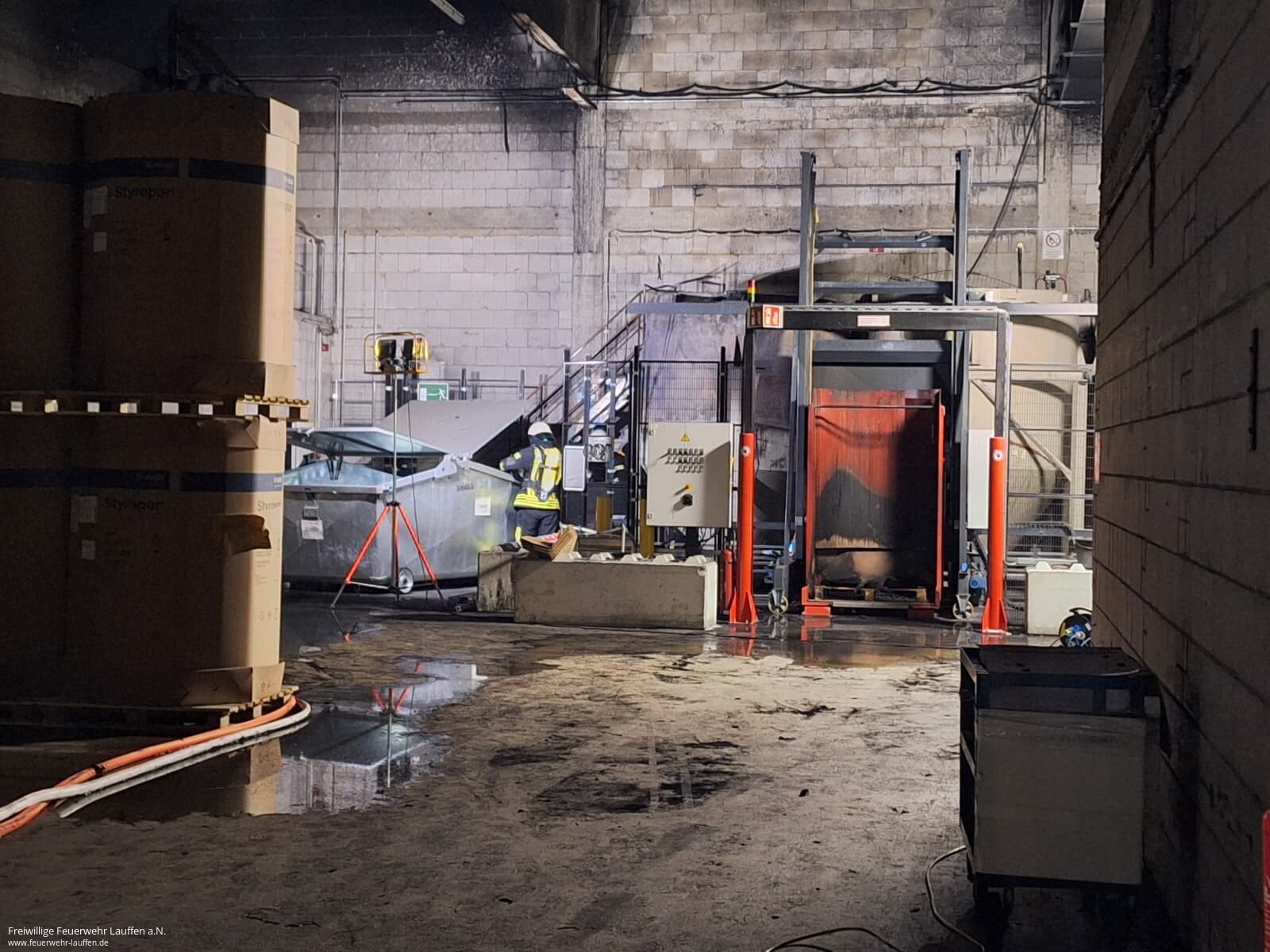 Durch diese Maßnahmen konnte eine weitere Ausbreitung verhindert werden und das Feuer schnell gelöscht werden. Nach Eintreffen des Löschzug der Feuerwehr Lauffen wurde die Drehleiter am Gebäude in Stellung gebracht und die Fassade, sowie das Dach auf Glutnester kontrolliert. Dort war nichts feststellbar. Zusammen mit dem stellvertretenden Kreisbrandmeister, der Fachberaterin Chemie und des GW-Mess des Landkreis Heilbronn wurde das weitere Vorgehen besprochen und geplant. Die Kläranlage wurde über das abgegebene und konterminierte Löschwasser informiert. Seitens der Kläranlage und der Fachberaterin Chemie gab es hier jedoch keine Bedenken und Auffälligkeiten. Der GW-Mess führte Messungen im Brandbereich und in der Umgebung durch. Es konnten auch hier keine Auffälligkeiten festgestellt werden, lediglich direkt im Brandbereich war eine höhere Konzentration CO messbar.